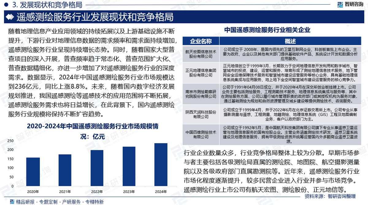 市场规模:随着地理信息产业应用领域的持续拓展以及上游基础设施不断提升,下游行业对地理信息数据的需求频率和需求面持续增加,遥感测绘服务行业呈现持续增长态势。同时,随着国家大型普查项目的深入开展,普查频率趋于常态化、普查范围扩大化、普查数据精细化,亦进一步增加了对遥感测绘服务行业的深度需求。数据显示,2024年中国遥感测绘服务行业市场规模达到236亿元,同比上涨8.8%。未来,随着国内数字经济发展规划推进,我国遥感测绘等遥感技术的应用范围将不断拓展,遥感测绘服务需求也将日益增长,在此背景下,国内遥感测绘服务行业规模将保持不断扩容趋势。