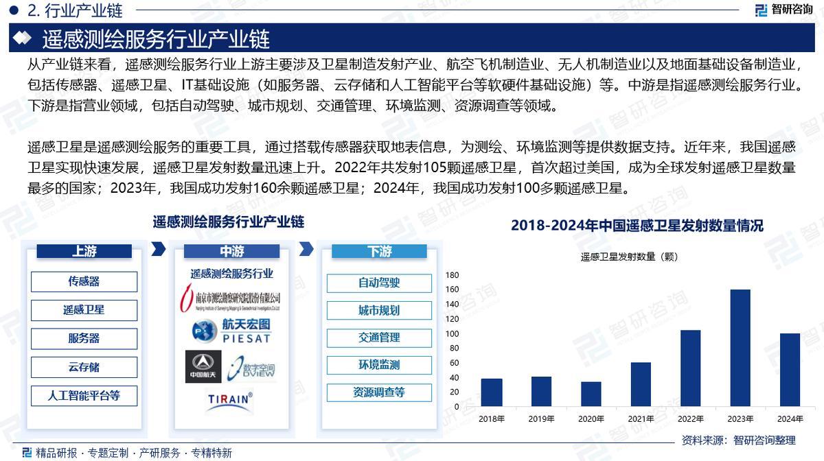 产业链:从产业链来看,遥感测绘服务行业上游主要涉及卫星制造发射产业、航空飞机制造业、无人机制造业以及地面基础设备制造业,包括传感器、遥感卫星、IT基础设施(如服务器、云存储和人工智能平台等软硬件基础设施)等。中游是指遥感测绘服务行业。下游是指营业领域,包括自动驾驶、城市规划、交通管理、环境监测、资源调查等领域。