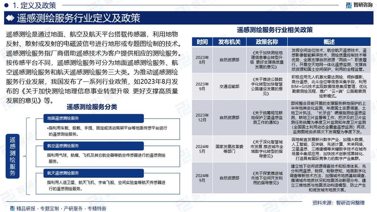 政策环境:为推动遥感测绘服务行业发展,我国发布了一系列行业政策,如2023年8月发布的《关于加快测绘地理信息事业转型升级 更好支撑高质量发展的意见》中,提出发挥空间定位技术、航空航天遥感技术、遥感影像智能解译技术、测绘质量控制技术等优势,全面支撑自然资源“两统一”职责履行。开展空天地网一体化遥感监测,支撑自然资源和国土空间保护、利用的全程监管。